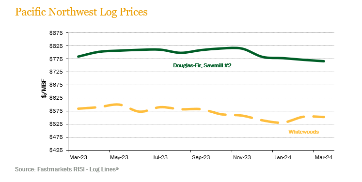 PACIFIC NORTHWEST — Pacific Northwest pricing continued to soften during the quarter. Log Lines® reported that average delivered prices for Douglas-fir #2 logs decreased 4.4% quarter-over-quarter and 6.6% year-over-year. Whitewoods’ (i.e., true firs and hemlock) average delivered log prices fell 1.4% during the quarter and 9.7% year-over-year.