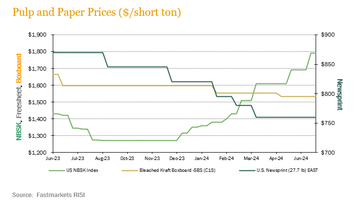 PULP AND PAPER — Demand for pulp and paper products varied during the quarter. The benchmark NBSK (northern bleached softwood kraft) pulp price index saw significant gains, increasing 18.5% for the quarter and finishing 25.2% above year-ago levels. U.S. newsprint (27.7 lb.) prices fell 2.6% over the quarter and 12.6% year-over-year. Boxboard prices fell 1.4% during the quarter and ended 7.9% below last year’s level.